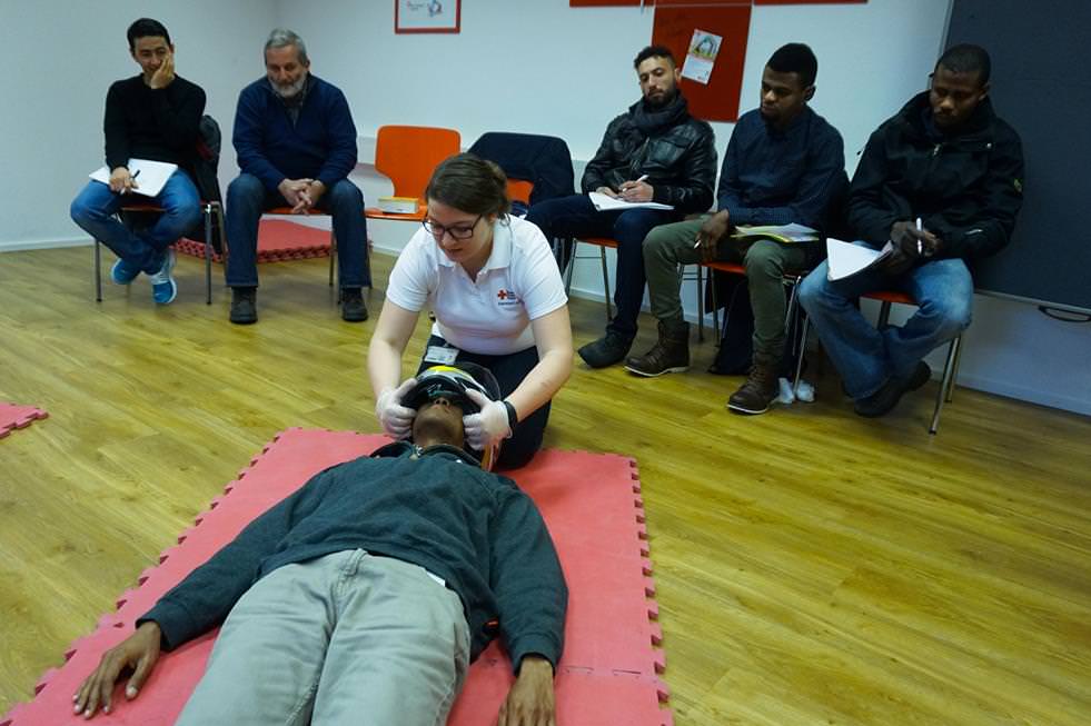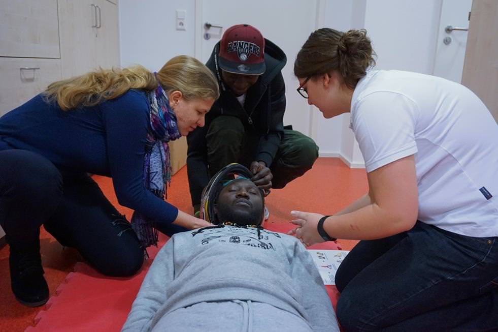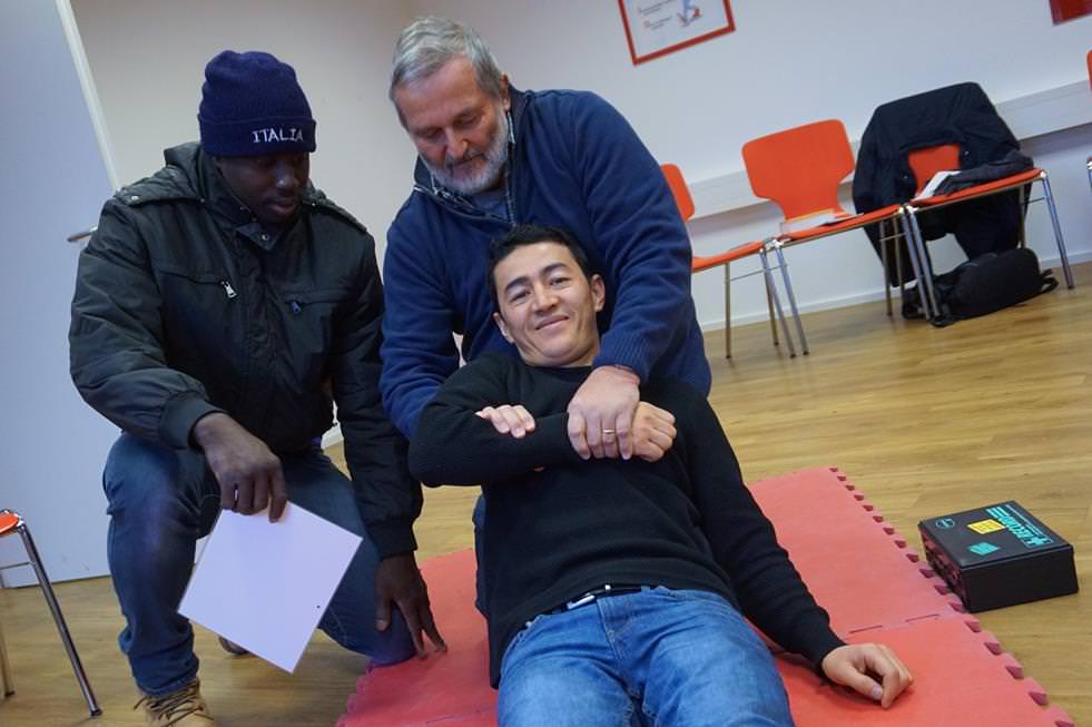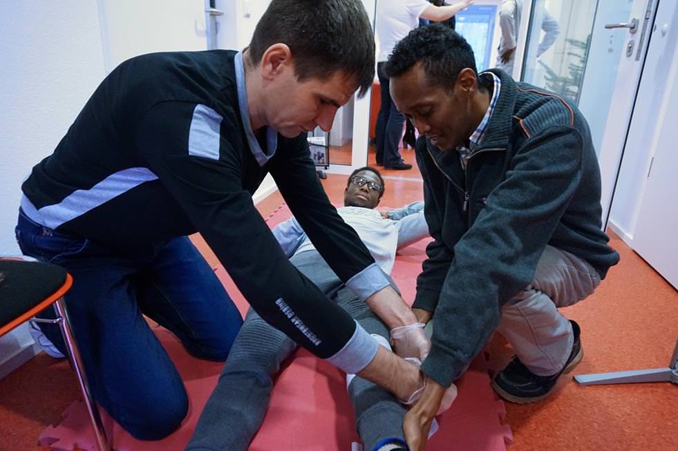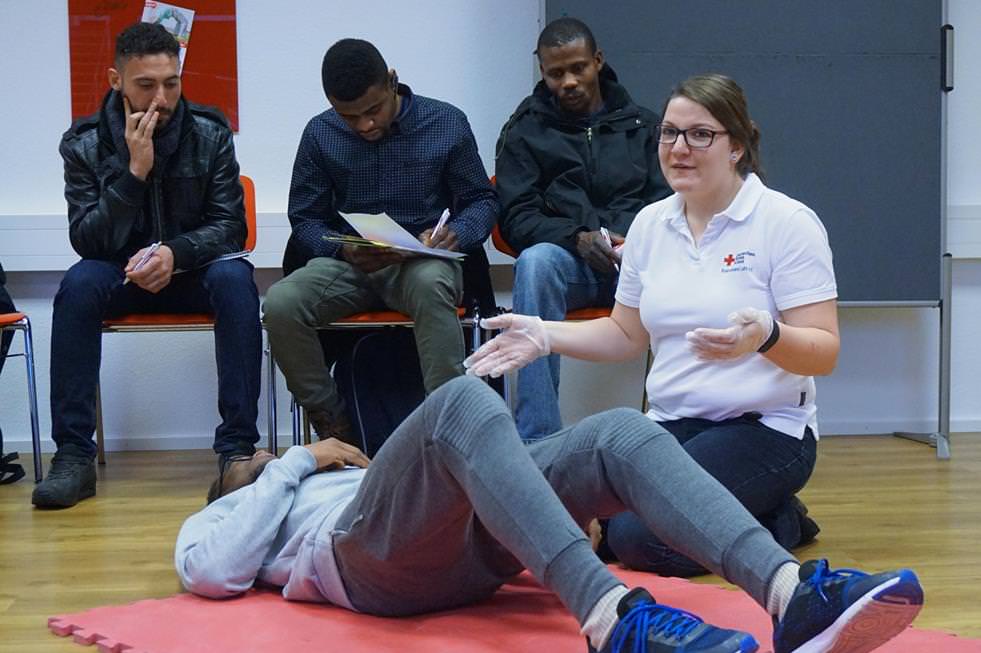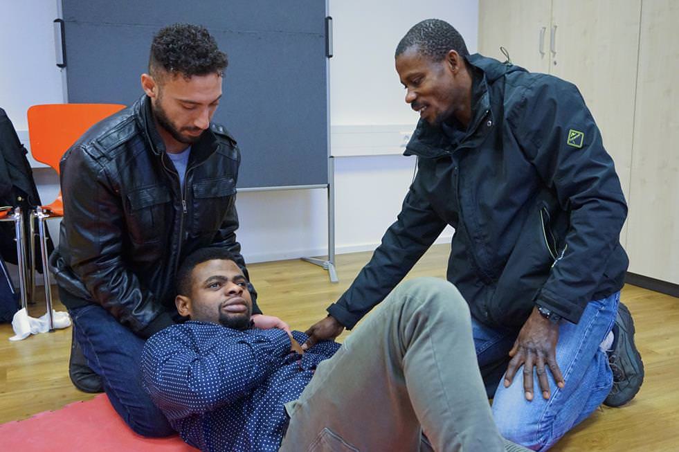 „Wichtig ist, die Nummer 112 anzurufen und genau zu erklären, was passiert ist“, sagt Bianca Oesterle und fragt lieber noch einmal nach: „Alles verstanden?“ „Alles klar“, bestätigen die jungen Frauen und Männer, die vor ihr sitzen. Dass diese Information bei den Menschen auch wirklich ankommt, ist nicht selbstverständlich. Sie sind Flüchtlinge, die einen Erste-Hilfe-Kurs besuchen und für die die deutsche Sprache noch nicht geläufig ist.