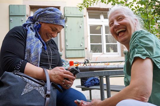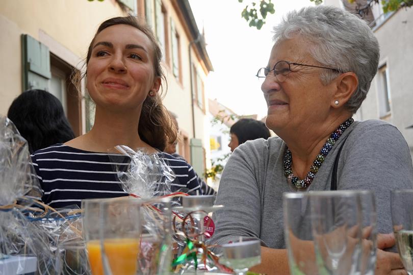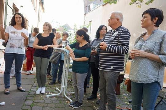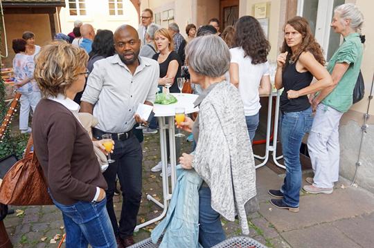 Flüchtlingshelferinnen und -helfer werden zum Dank für ihr Engagement im Innenhof des Begegnungshauses mit internationalen Häppchen, Sekt und Saft verköstigt.